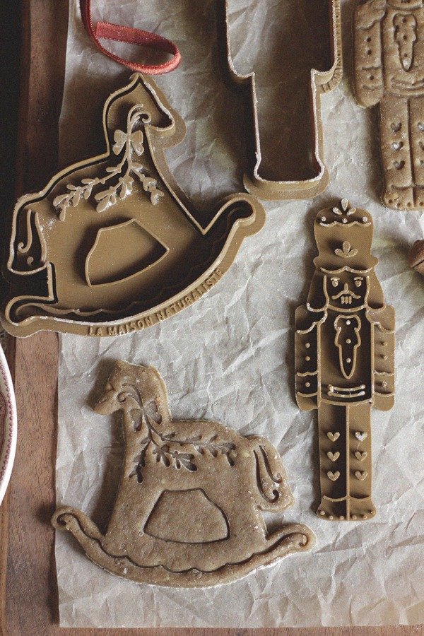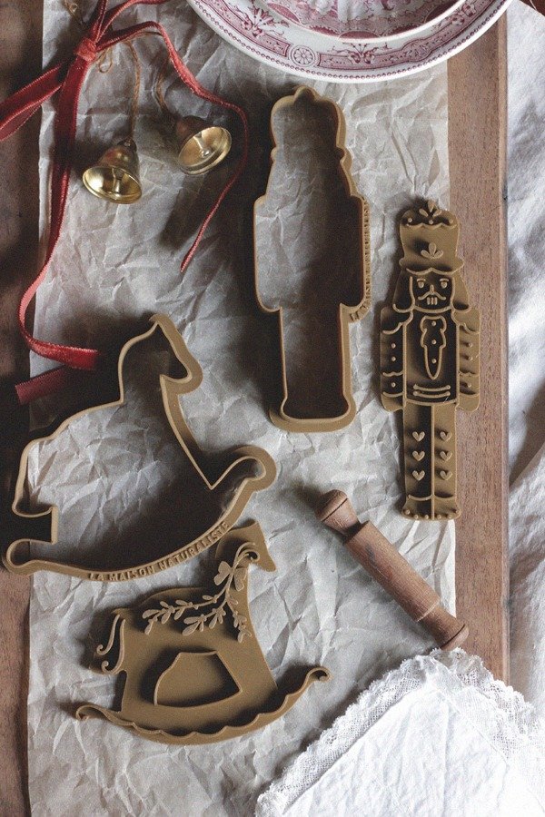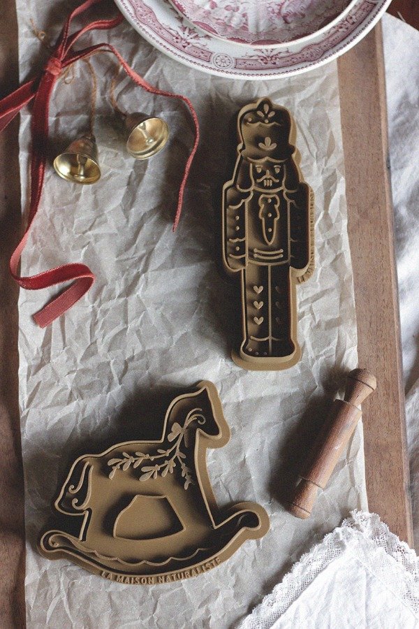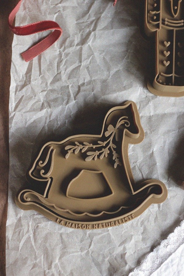 Cortantes de galletas con sello marcador. El set se compone de 4 piezas: 2 cortantes y 2 sellos marcadores desmontables con motivos de Cascanueces y Caballito Mecedor.