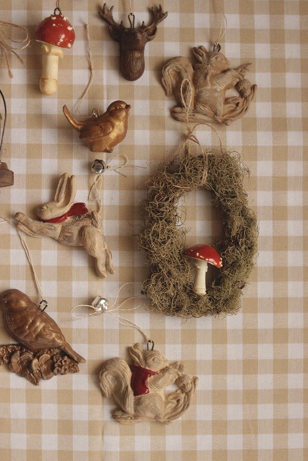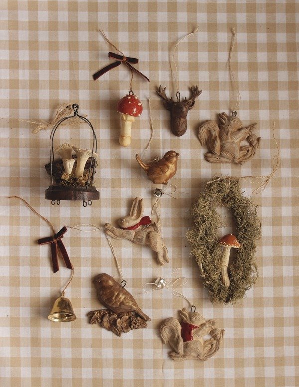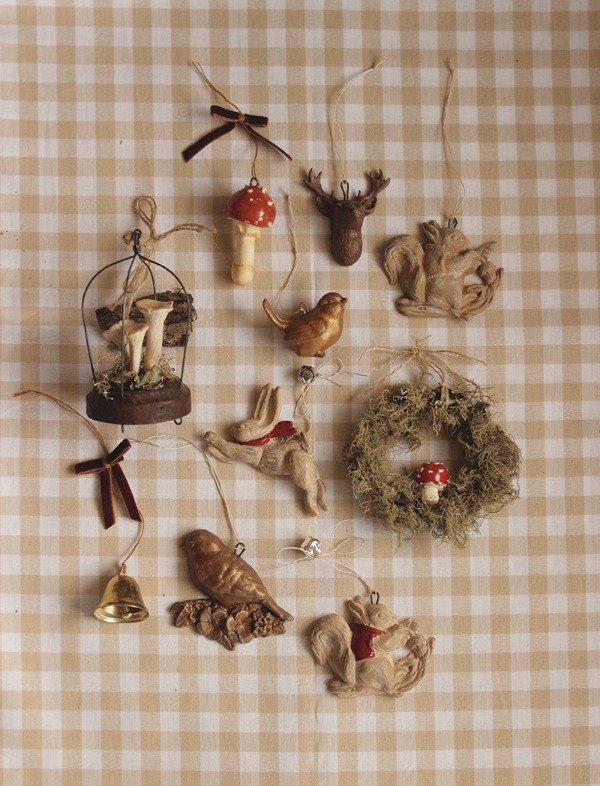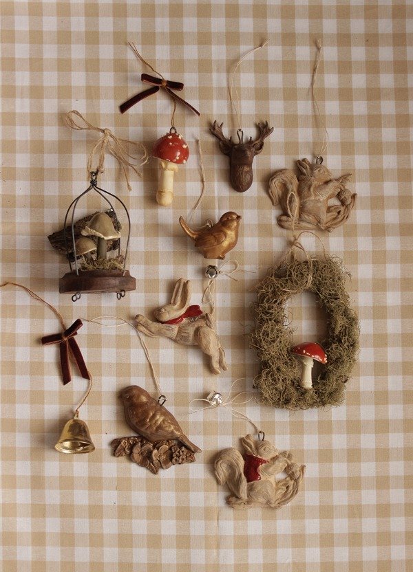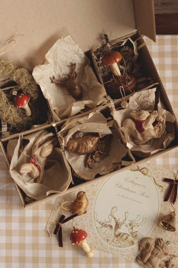 Caja con adornos navideños inspirada en la naturaleza y en la vida en el bosque. Vienen 10 adornos en total, un mix de animalitos con cascabeles y setas.