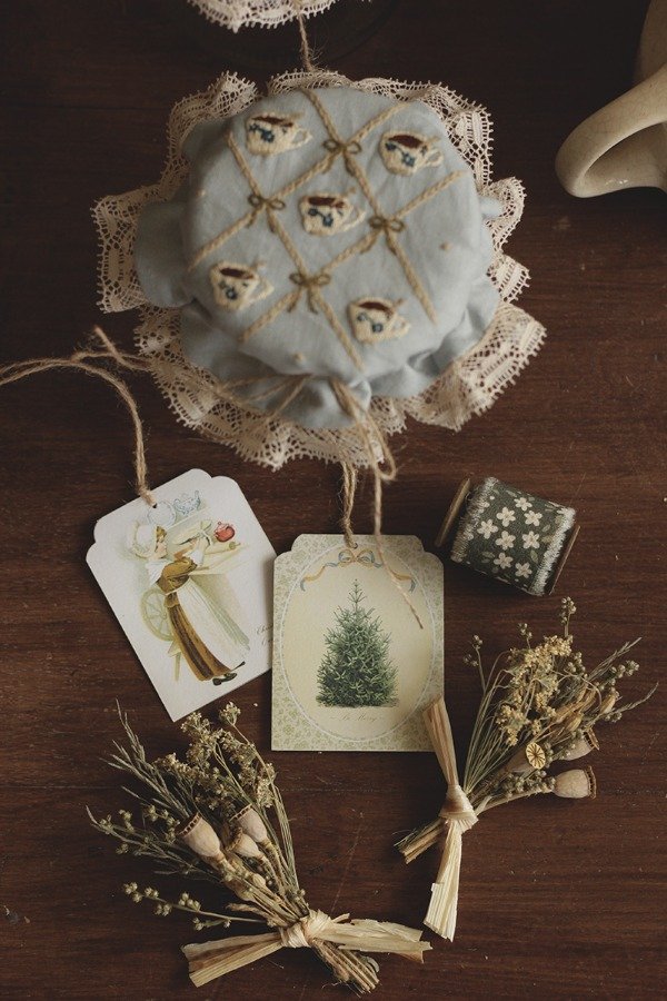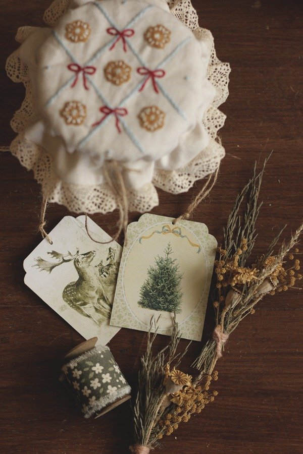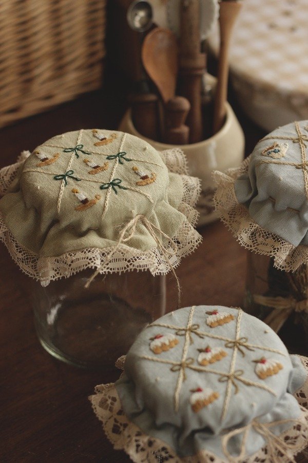 Un frasco repleto de aroma a Navidad. Una fundita bordada a mano, viste la tapita con mucho detalle. La colección "" tiene motivos Navideños: candelabros, vajilla antigua, cookies y bundt cake. Adentro del frasco vienen dos ramitos de flores secas, 2 tags y un carretel con cinta navideña, ideal para envolver regalos. El set viene armado tal cual como se ve en las fotos, todos son distintos.