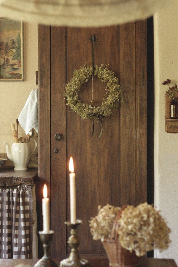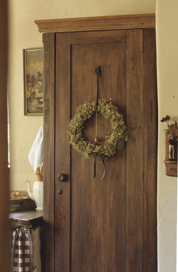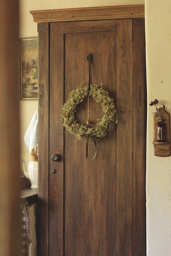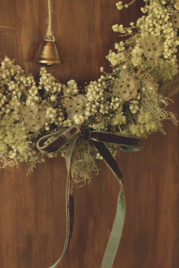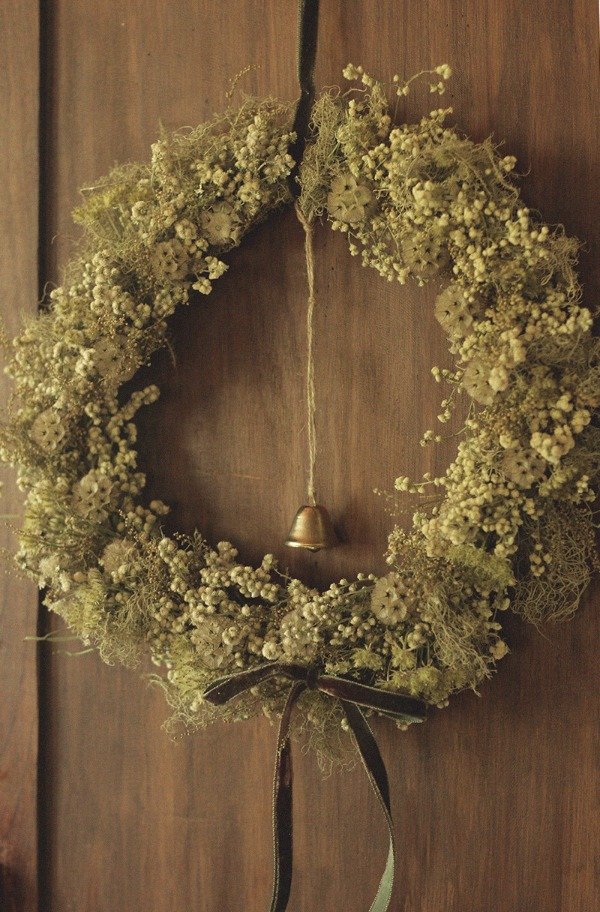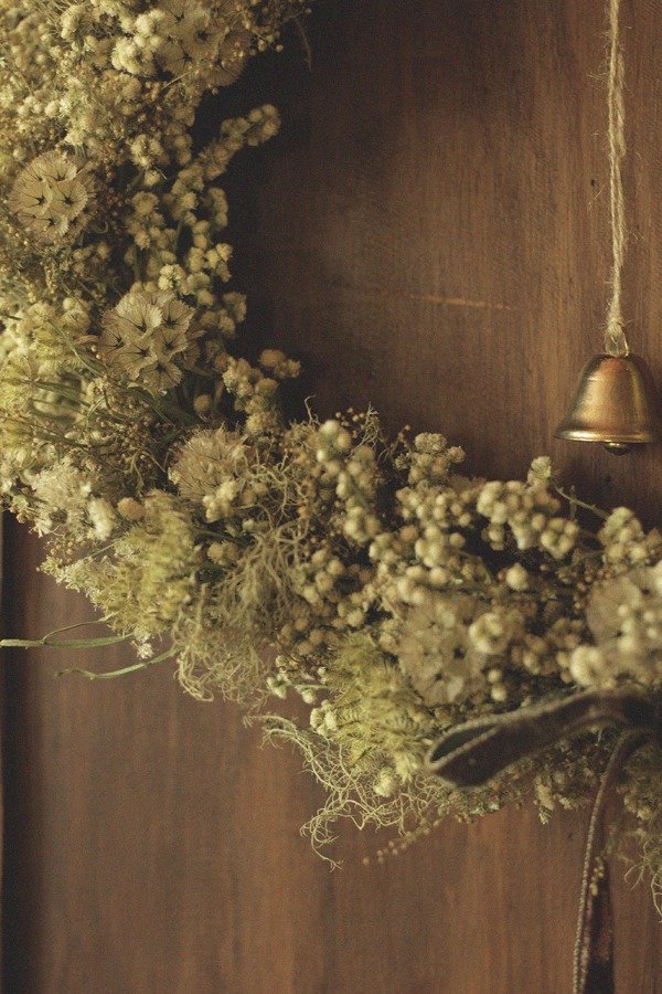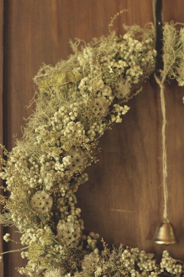 La Corona Liquen tiene tonos verdes suaves y blancos antiguos. Se compone de flores de Carquejilla y Sweet Annie, frutos de Scabiosas y Liquen. Trae una campanita de metal y un lazo de terciopelo verde tal cual como se ve en las fotos.