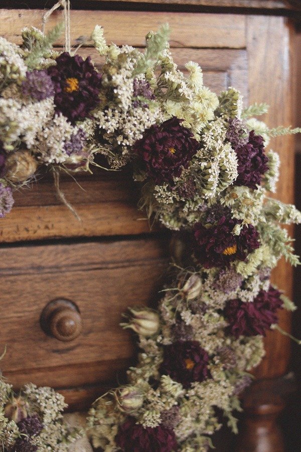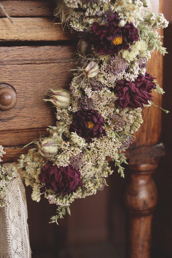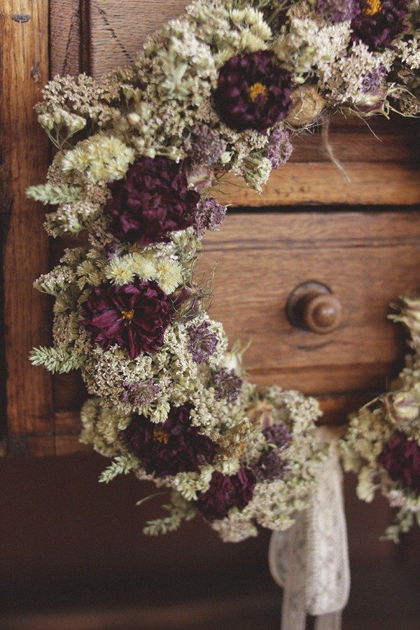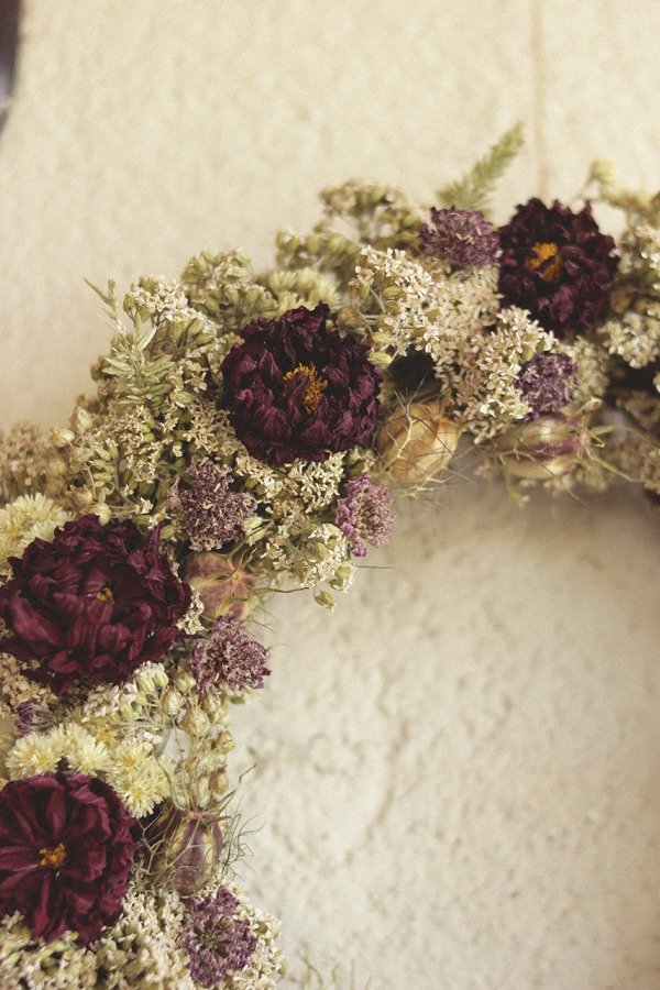 La Corona Dhalia en tonos manteca y bronceado, combinados con púrpuras y rosados. Se compone de flores aromáticas de Marcela, Milenrama, Dhalias, Scabiosas y Frutos de Nigella. Esta corona tiene un aroma delicioso, ya que muchas flores conservan la esencia luego de ser secadas.