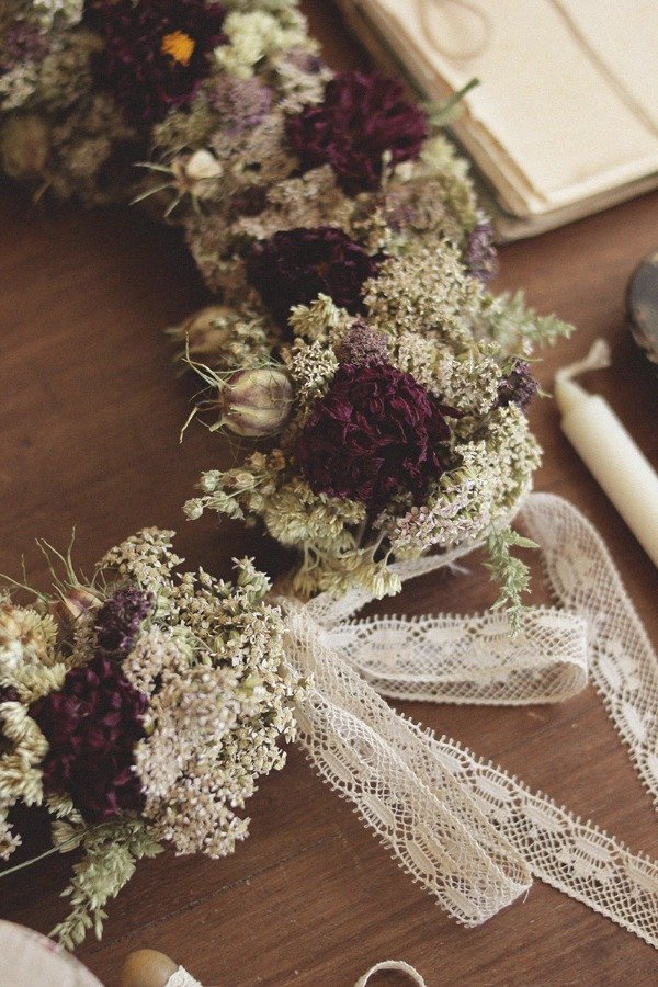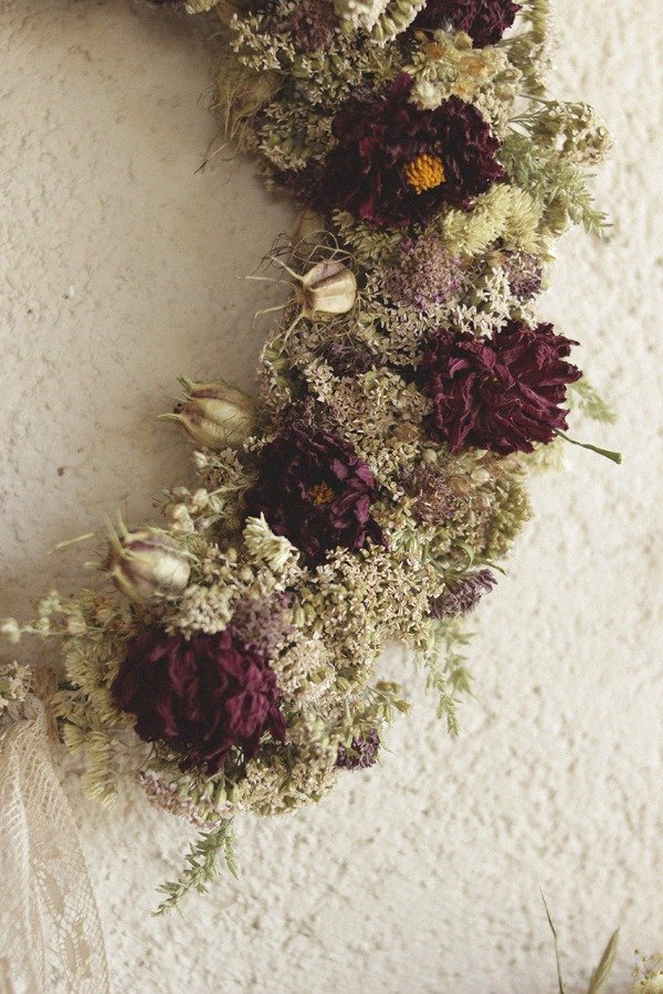 Corona decorativa perenne, realizada con materiales naturales y puntillas antiguas. Cada uno de los pastos, flores y frutos que componen esta corona fue cultivado en nuestro jardín en las montañas, libres de pesticidas y fertilizantes artificiales. La manera de preservarlos es completamente natural, sin colorantes ni agentes químicos. Ideales para sumar un estilo Cottagecore a un rincón de nuestro hogar o celebración ^_^