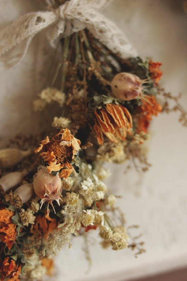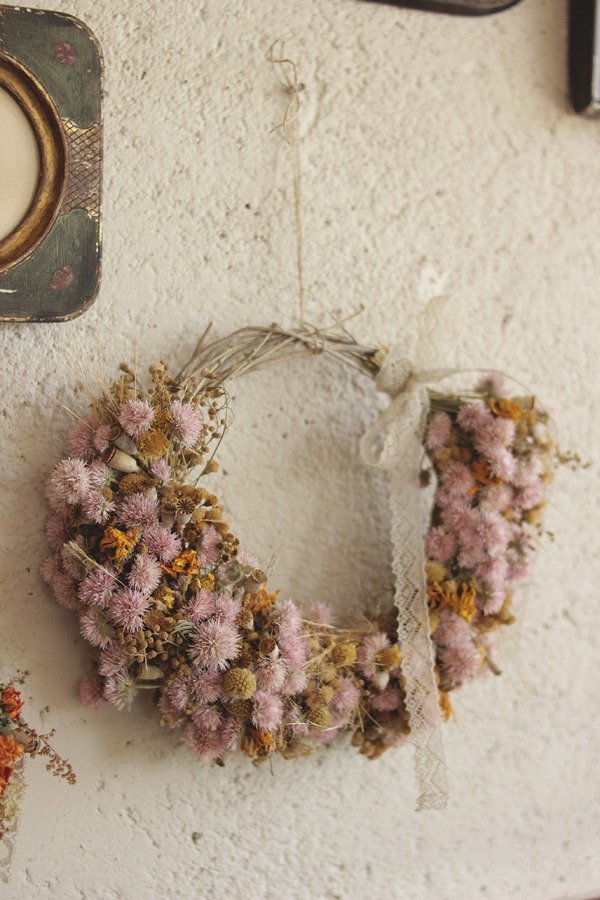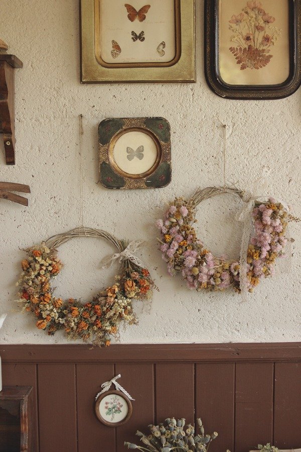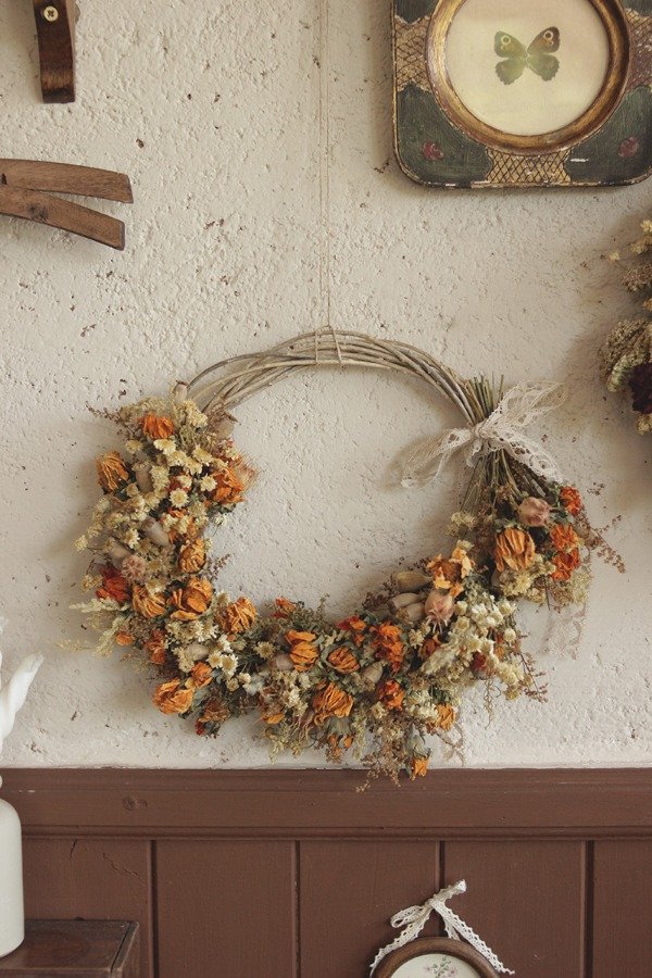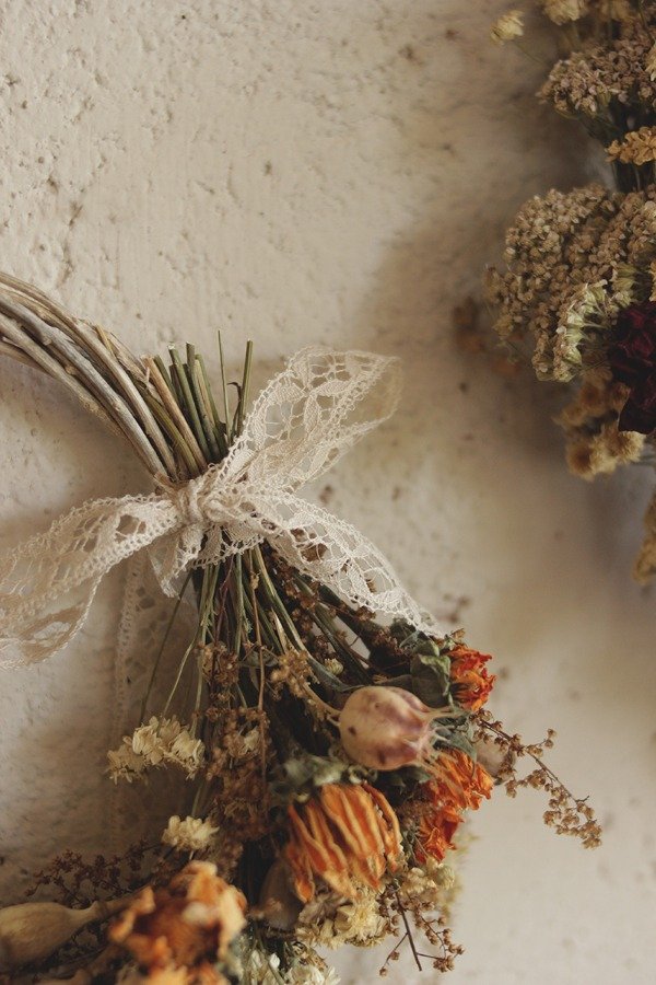 Media corona perenne decorativa, realizada con materiales naturales y puntillas antiguas. Cada uno de los pastos, flores y frutos que componen esta corona fue cultivado en nuestro jardín en las montañas, libres de pesticidas y fertilizantes artificiales. La manera de preservarlos es completamente natural, sin colorantes ni agentes químicos. Ideales para sumar un estilo Cottagecore a un rincón de nuestro hogar o celebración ^_^