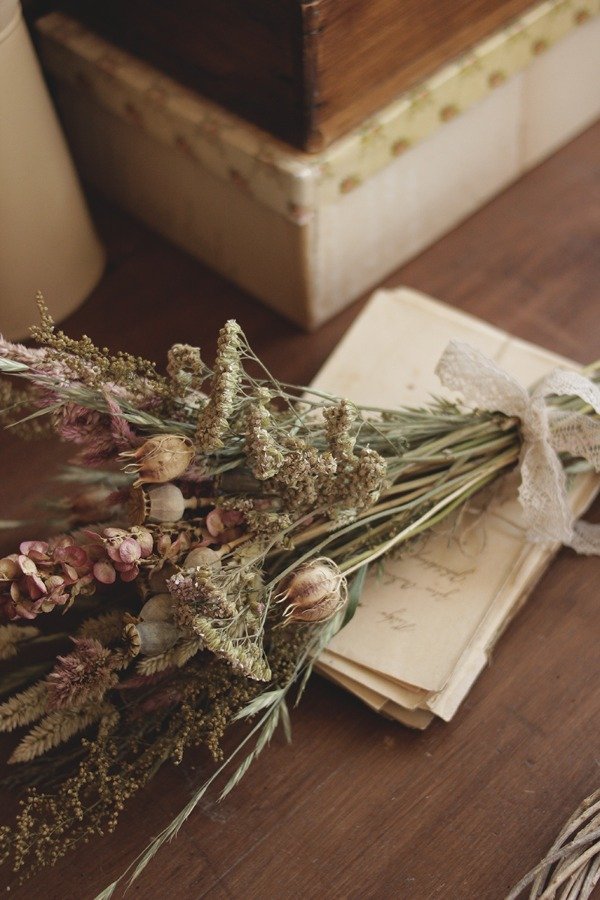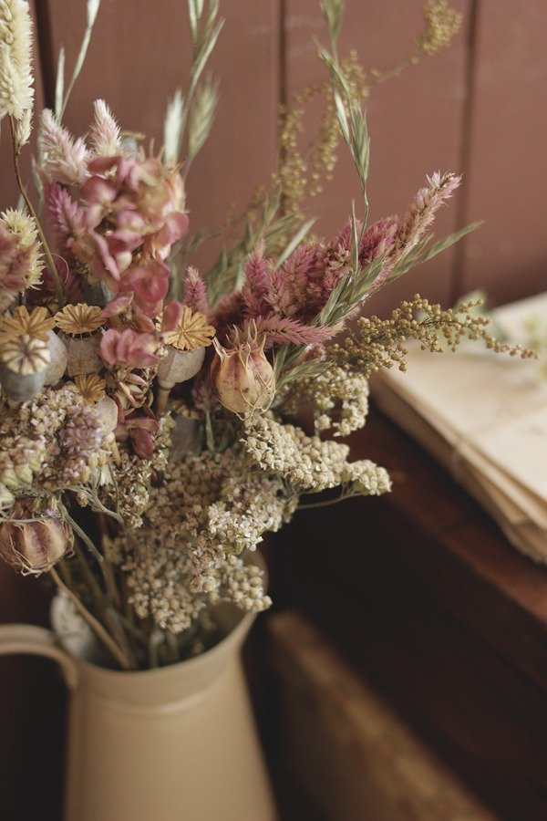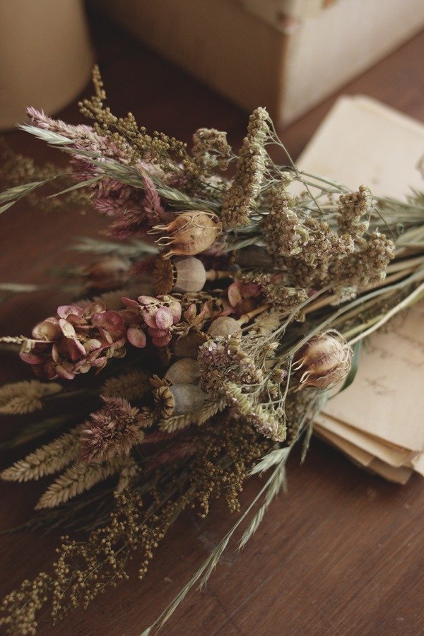 Ramo perenne ideal para regalar, decorar un lindo jarrón o colgar boca abajo y dar un aspecto "campestre" a un rincón de nuestro hogar. Con flores de Celosías, Milenrama y Scabiosas, Frutos de Amapolas y Armuelle, combinado con gramíneas. Los tonos rosados antiguos de las flores quedan preciosos contrastados con el verde suave de la cebadilla. Cada pasto, flor y fruto que lo componen, fueron cultivados desde semilla en nuestro jardín, en armonía con el entorno, sin pesticidas ni fertilizantes artificiales. Son orgánicos y naturales, secados cuidadosamente en nuestro taller, sin tratamientos químicos ni colorantes. Además viene con un precioso lazo de puntilla antigua ♡