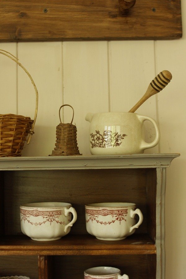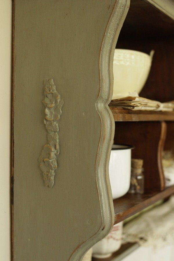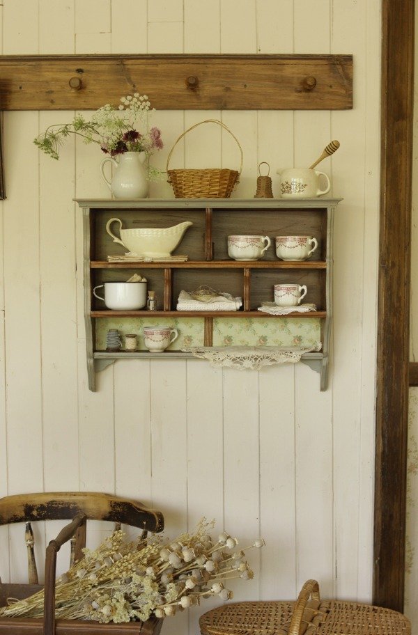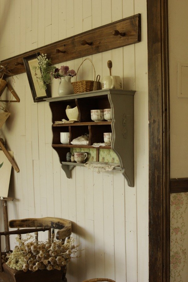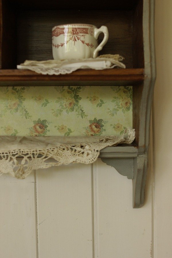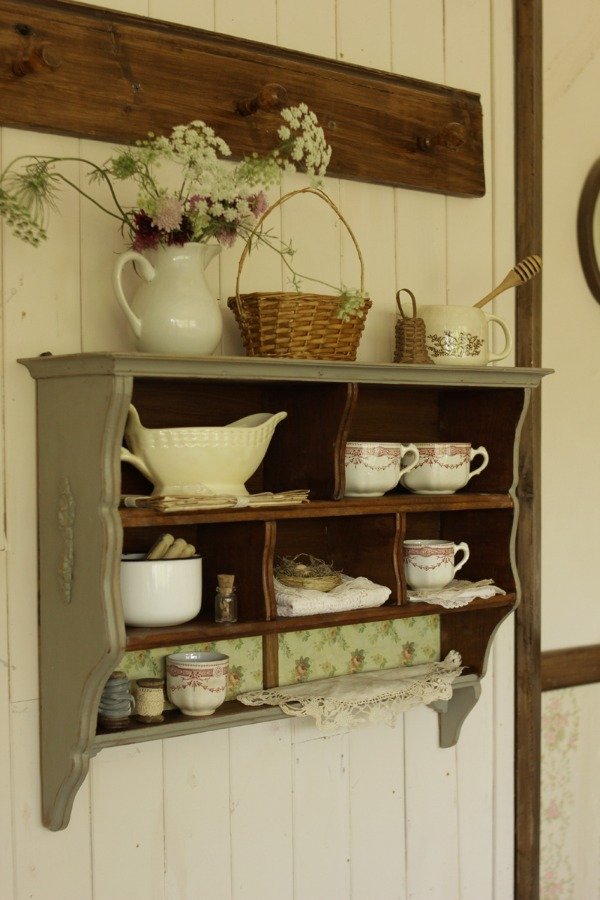 Estante organizador estilo Alacena. Realizado en madera antigua recuperada de Cedro. Tiene diferentes divisiones y estantes. En color gris celeste, laqueado satinado. Con detalles de molduras en relieve de guirnaldas de flores. Con empapelado vintage floral en el estante inferior.