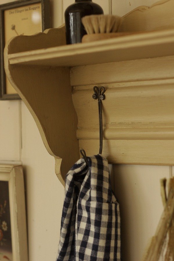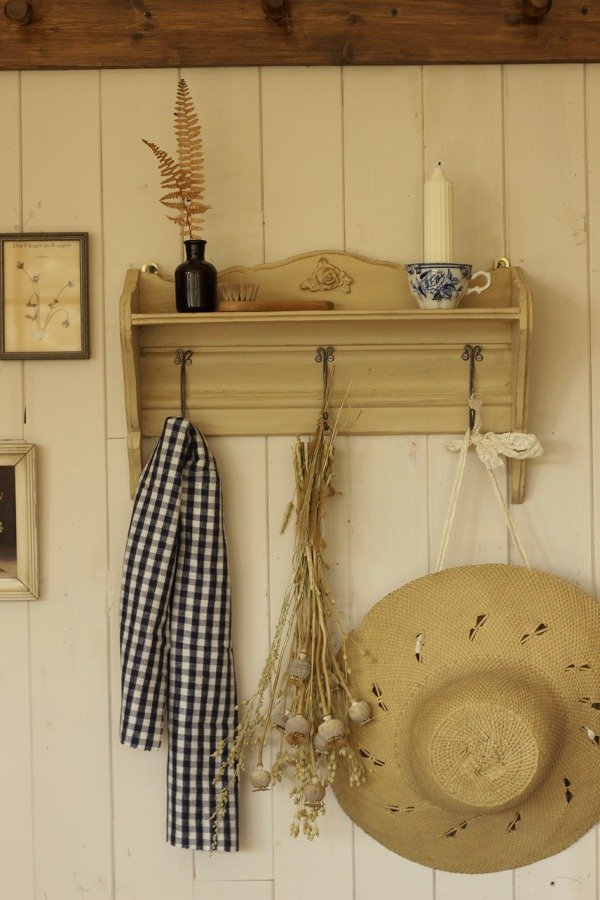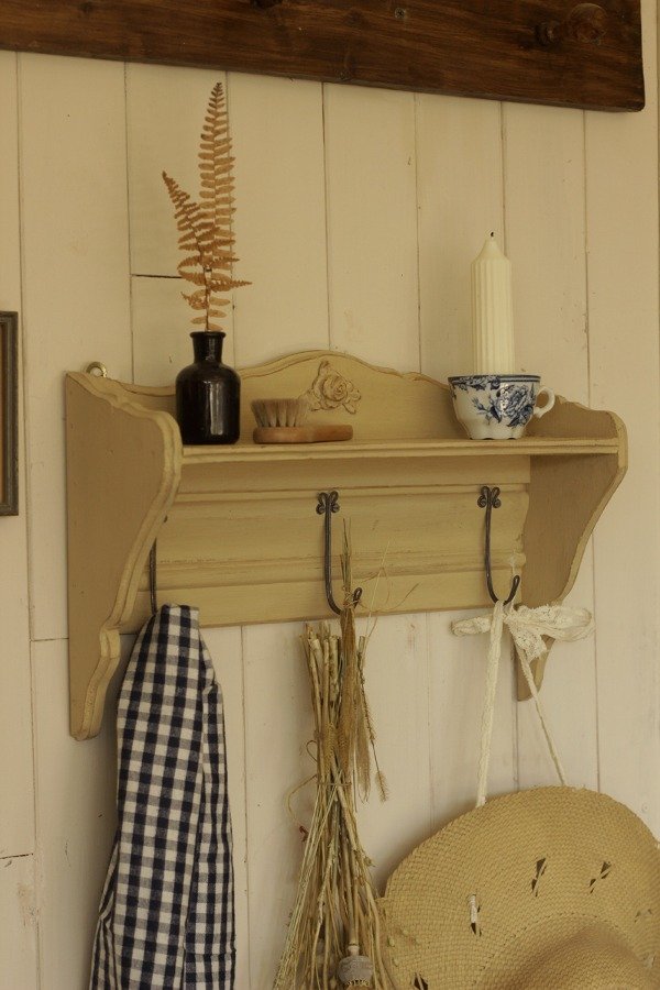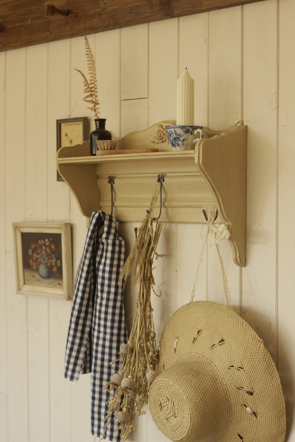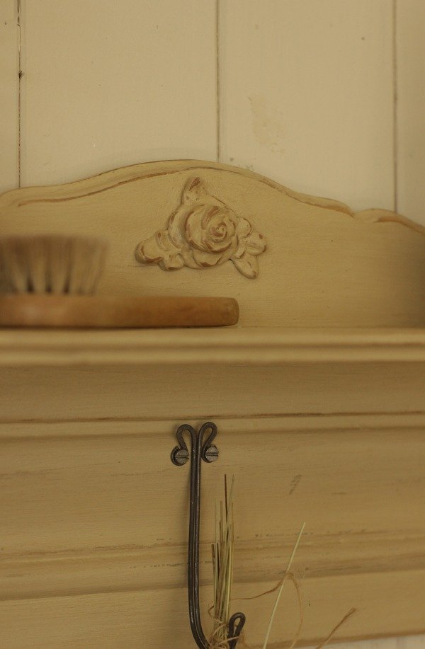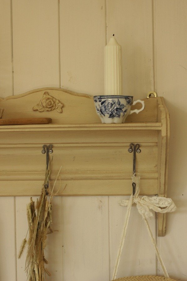 Estante recibidor con percheros. Realizado en madera maciza antigua recuperada de Pino Oregon y Pino Brazil. Ideal para la entrada a nuestro hogar, ya que tiene tres percheros muy resistentes. En color manteca, laqueado. Con destalles de molduras en relieve.
