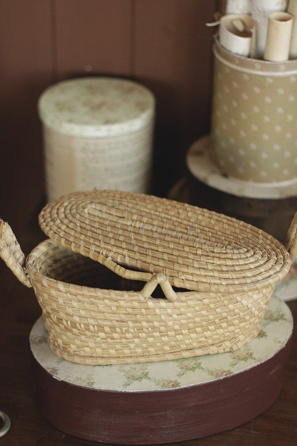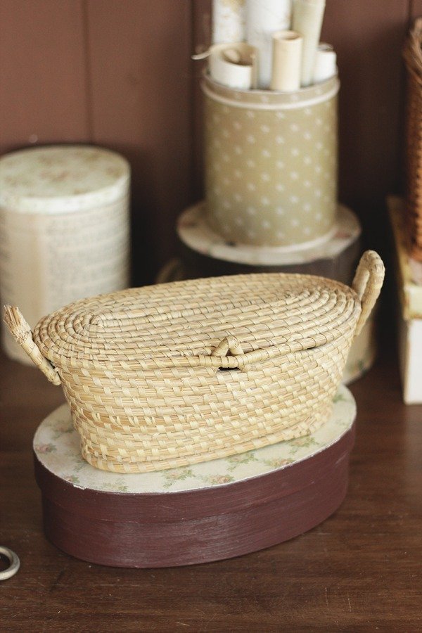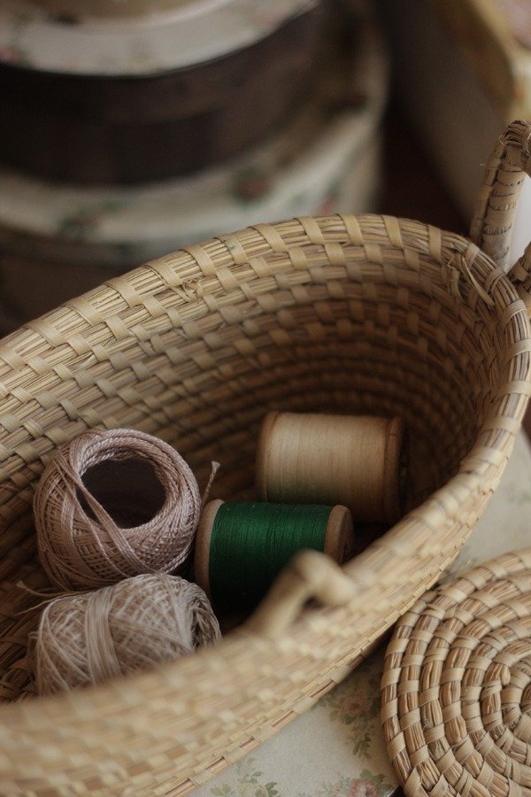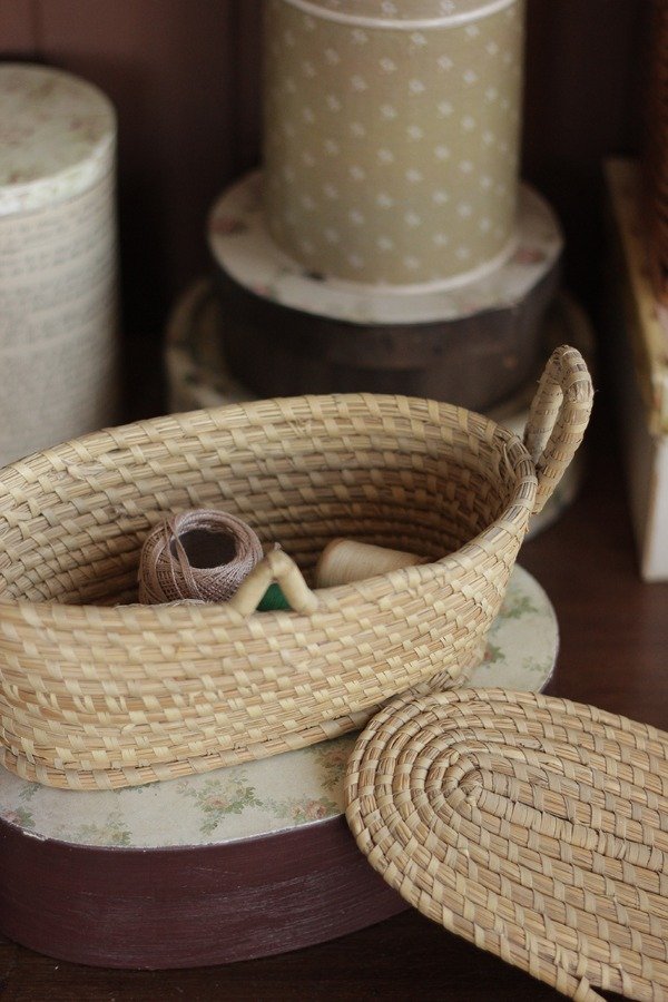 Hermoso y antiguo costurero de paja y rafia, viene con tapa y trabita.
