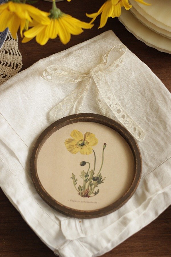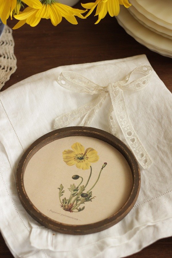 Cuadrito decorativo de MDF con reproducción de lámina antigua de historia natural. La imagen está laminada en mate, para que no se estropee con el tiempo o con la humedad, se puede limpiar fácilmente con un paño húmedo. Con puntilla antigua como lazo para colgar