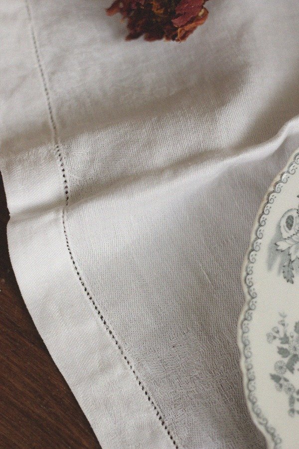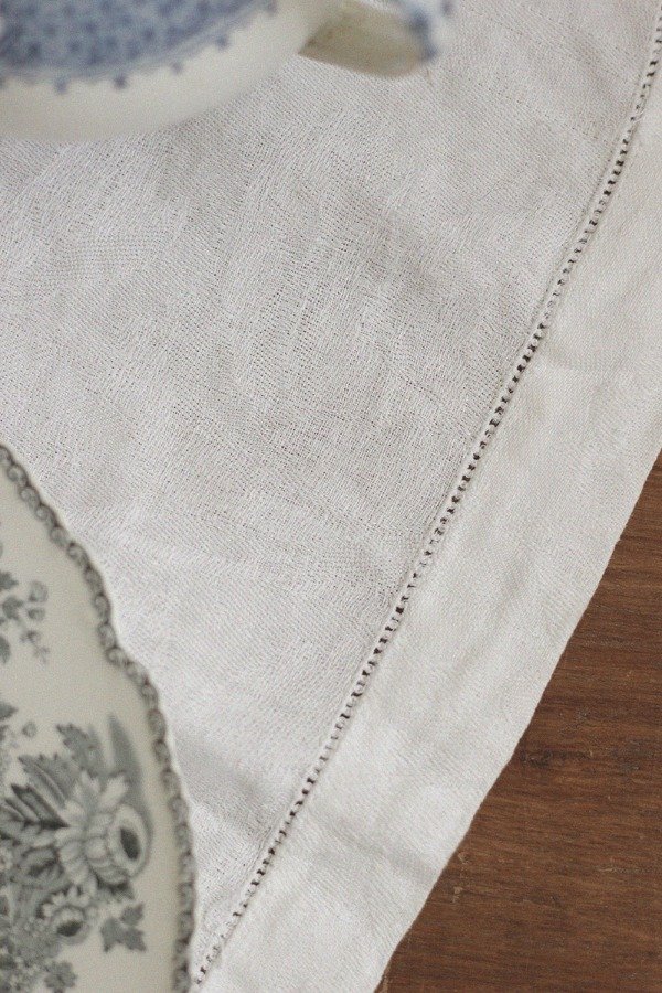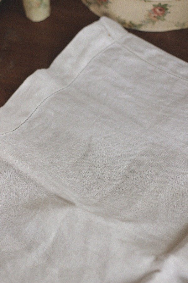 Mantelito antiguo en lino blanco, labrado, con trabajo de vainilla. Tienen una puntita un poco gastada.