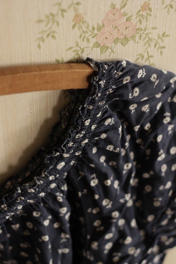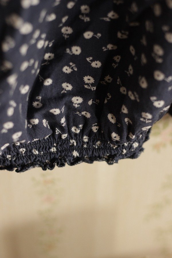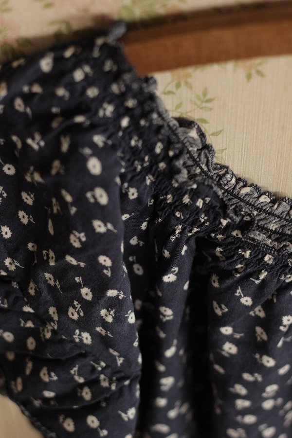 Blusa 100% fibrana, fresca y ligera, azul con pequeñas flores blancas. Con volados y frunces en cuello y cintura.