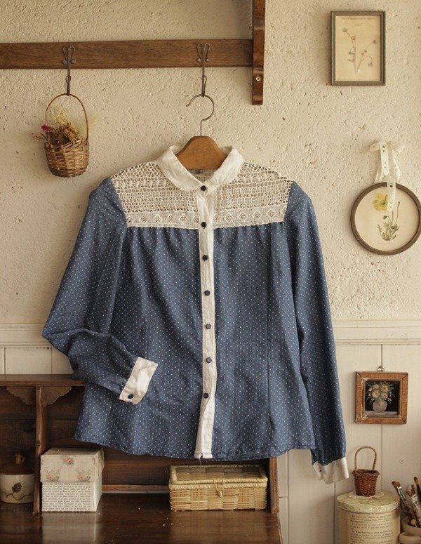 Preciosa camisa importada en género de algodón azul con lunarcitos crudo con detalles de encajes y broderie. Botoncitos en forma de flor
