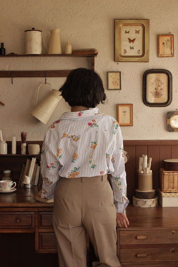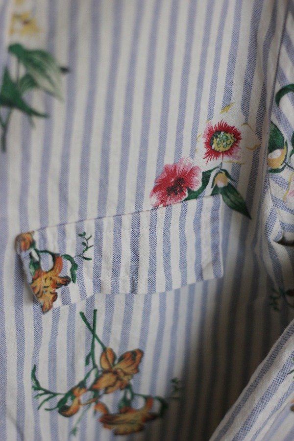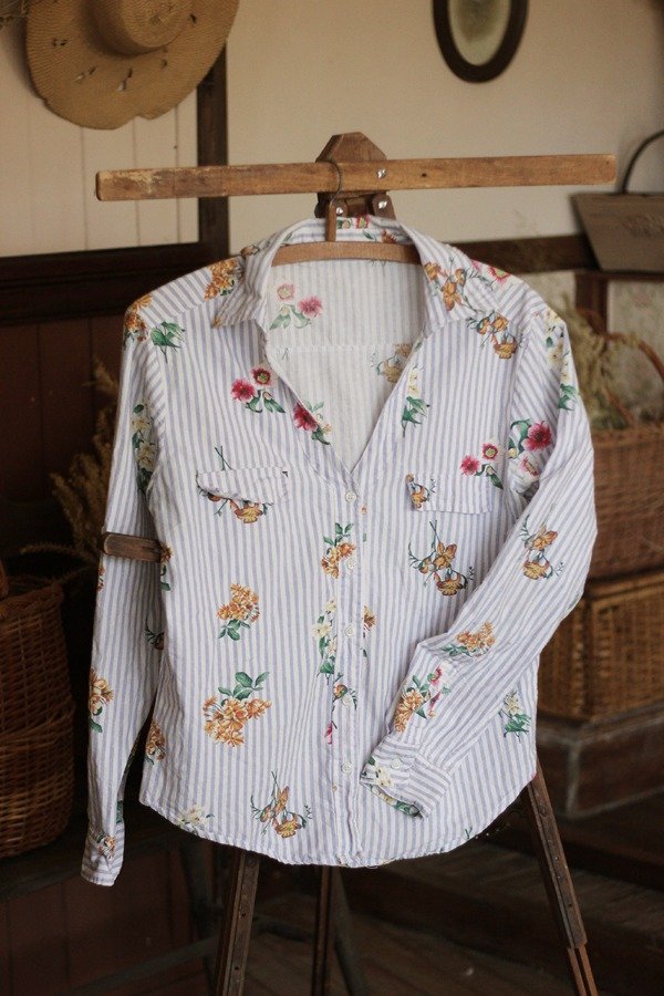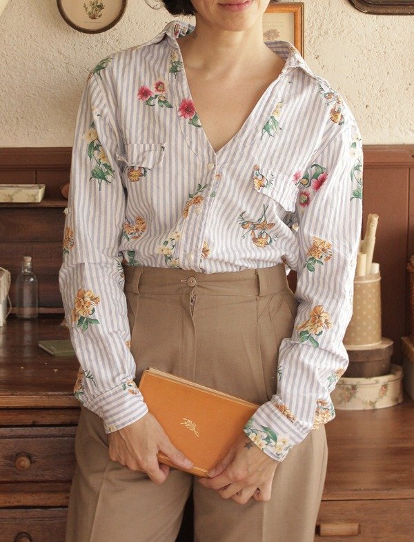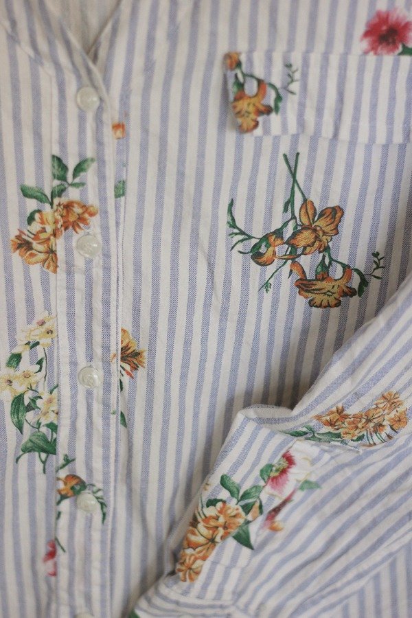 Hermosa camisa vintage 100% algodón con estampa de flores y ralas celestes. Súper suavecita.
