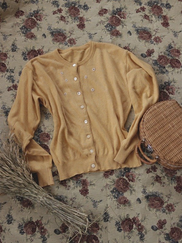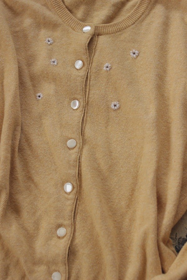 Cardigan tejido con bordaditos de margaritas y botones antiguos de nácar. Súper suavecito y no pica.