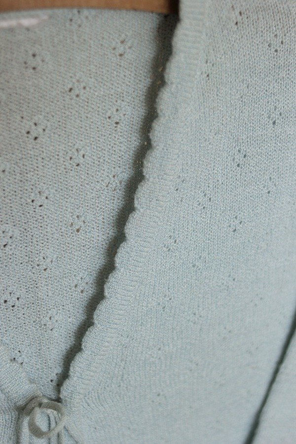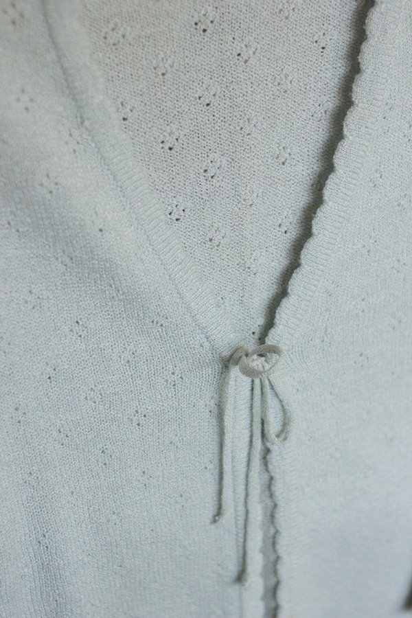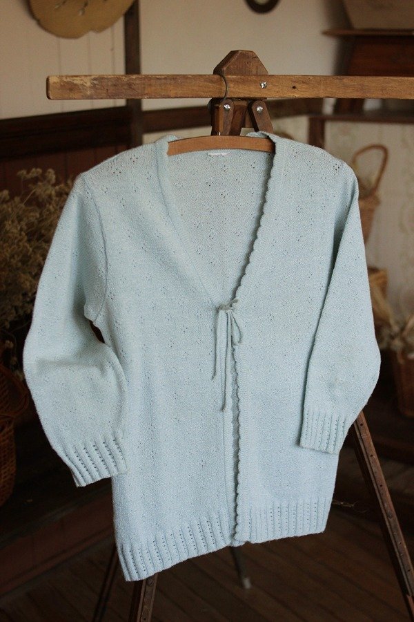 Saquito tejido, con calados y terminación de onditas. Con lacito para sujetar, es muy delicado. En color celeste.