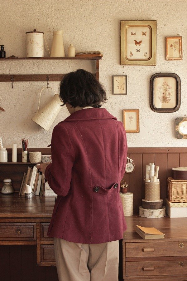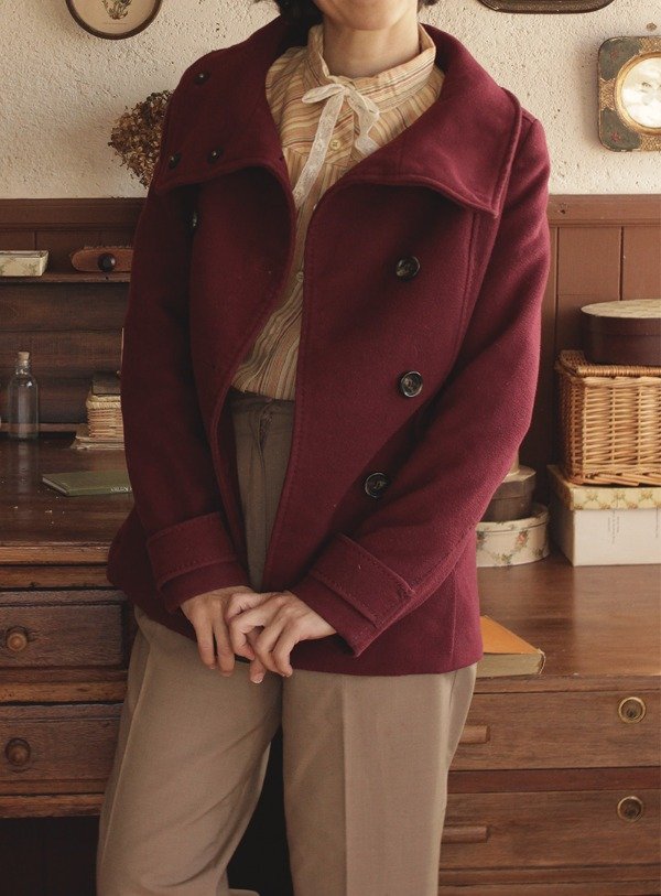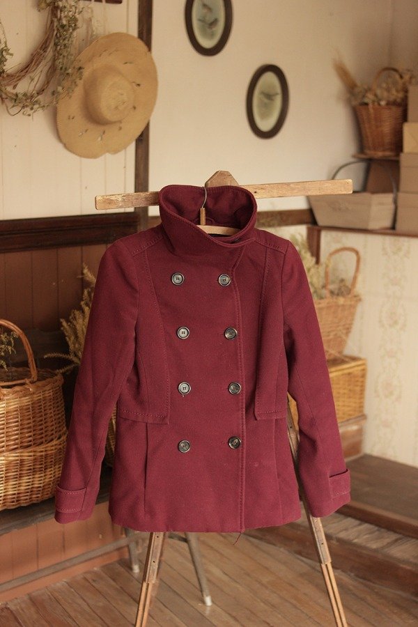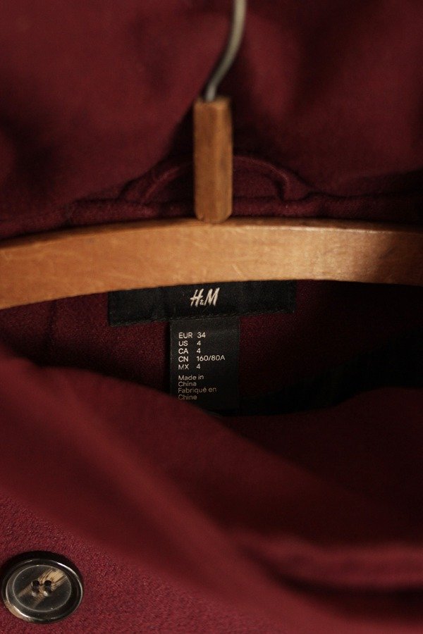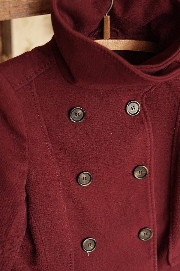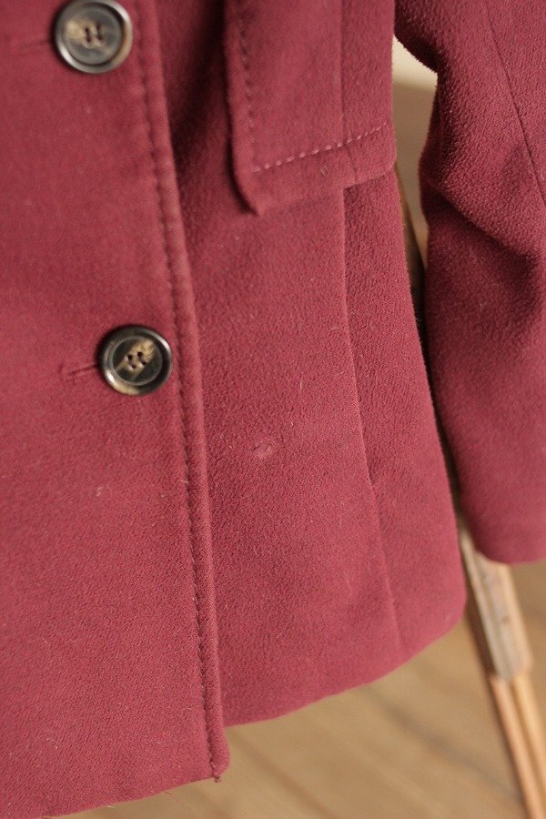 Tapado de paño, en color bordó, con bolsillos y cuello alto que también se puede bajar. Está forrado y tiene una pequeña manchita que se ve en la foto 6. Marca H&M