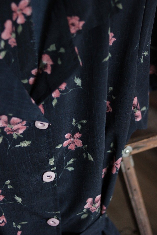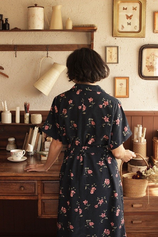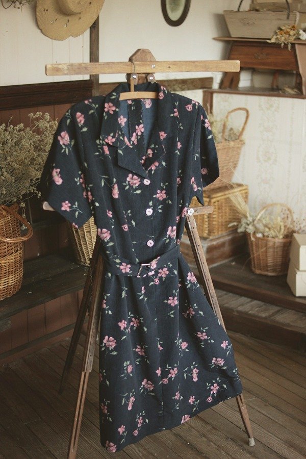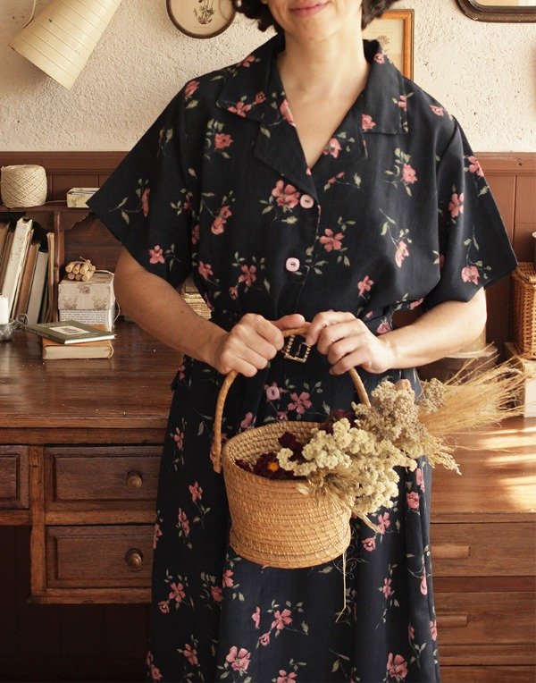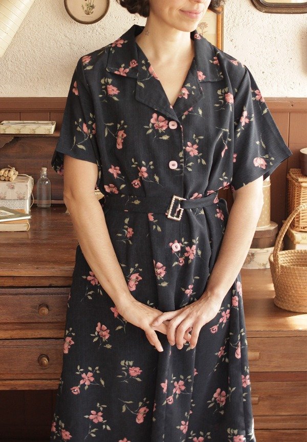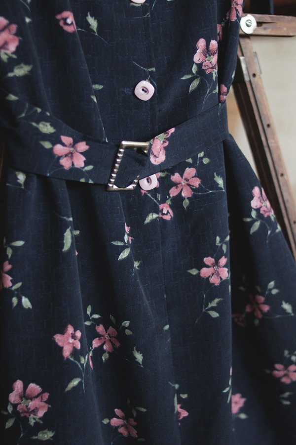 Hermoso y fresco vestido vintage de Fibrana, en color azul marino con estampado floreado. Tiene bolsillo. Viene con lazo para entallar a la cintura.