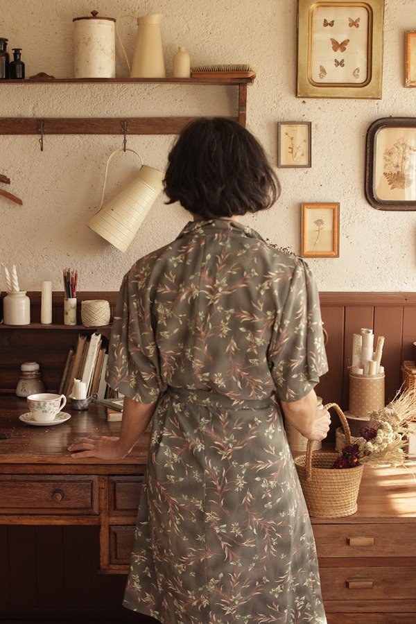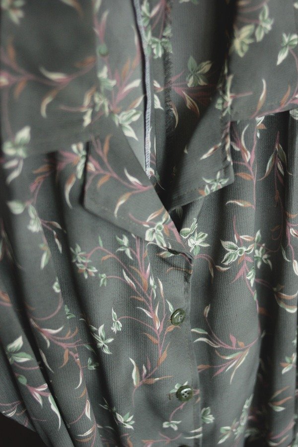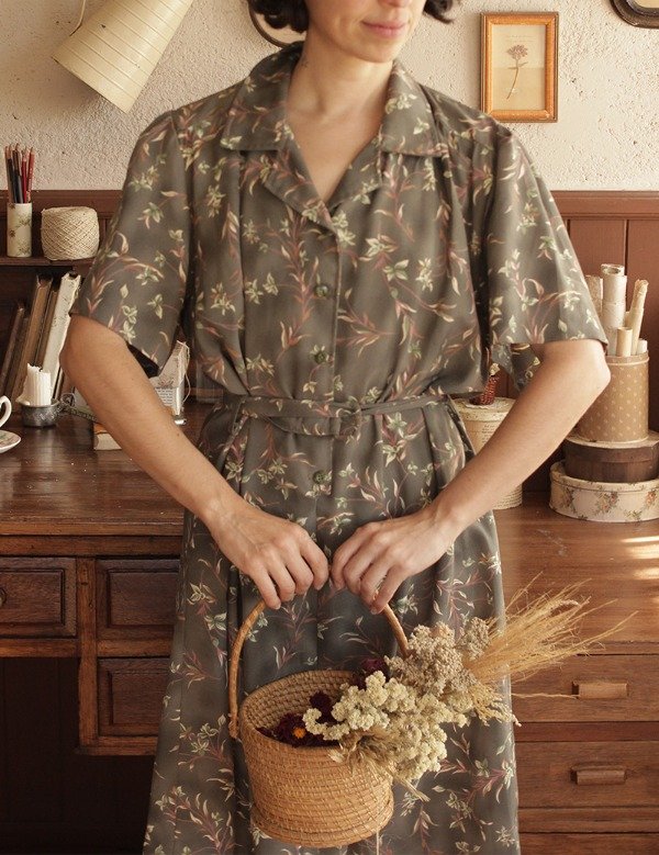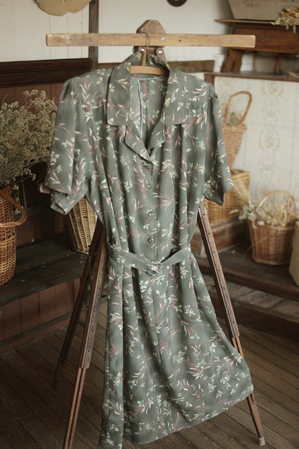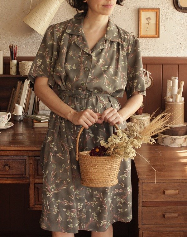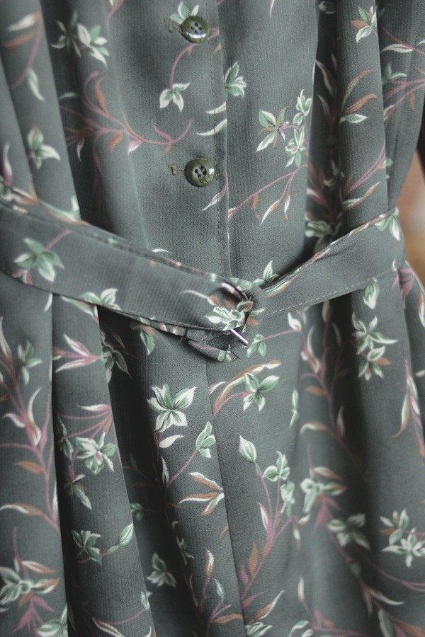 Hermoso y fresco vestido vintage de Fibrana, en color verde oliva con estampado floreado. Viene con lazo para entallar a la cintura.