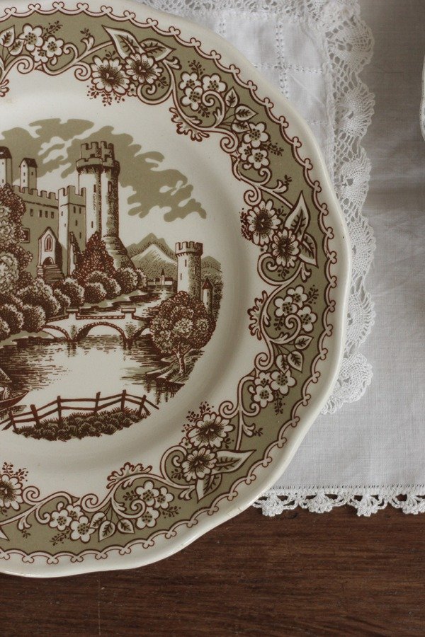 Precioso y único plato de postre de loza nacional Festival. Con escena de castillo en tonos beige. Impecable