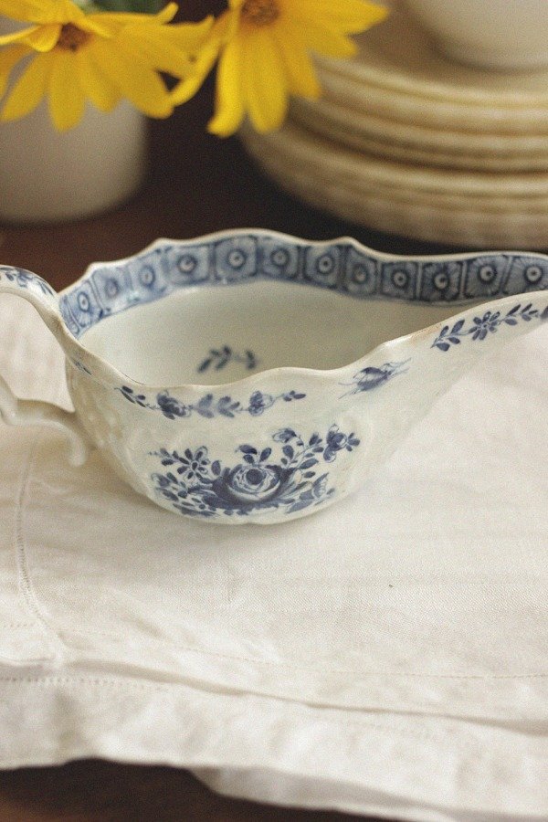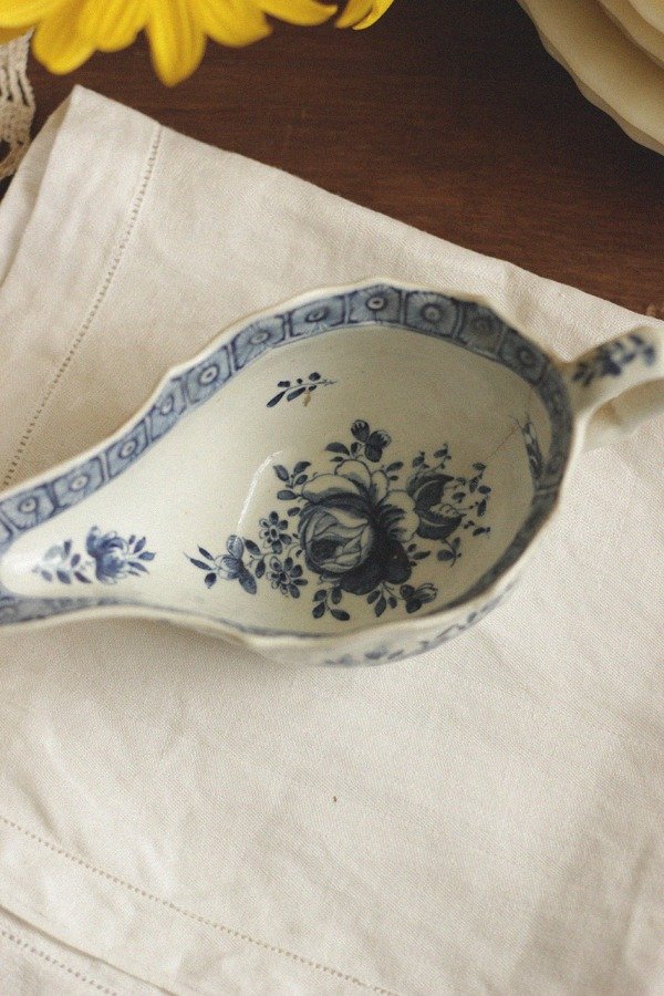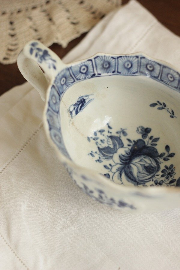 Preciosa salsera muy muy antigua, sin sello, en azul y blanco con relieves. Tiene un arreglo, nunca la usamos con agua, siempre con flores secas, potpurri o decoración.